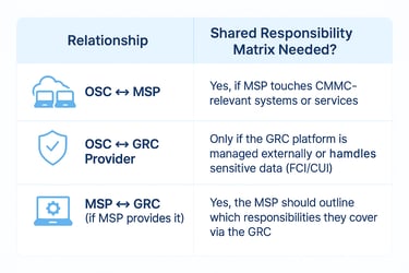 In the CMMC (Cybersecurity Maturity Model Certification) context, a Shared Responsibility Matrix (SRM) should exist between the Organization Seeking Certification (OSC) and any Managed Service Provider (MSP)—and by extension, also with any GRC platform the OSC uses if it impacts implementation or evidence collection for CMMC controls. Here’s how this typically breaks down: